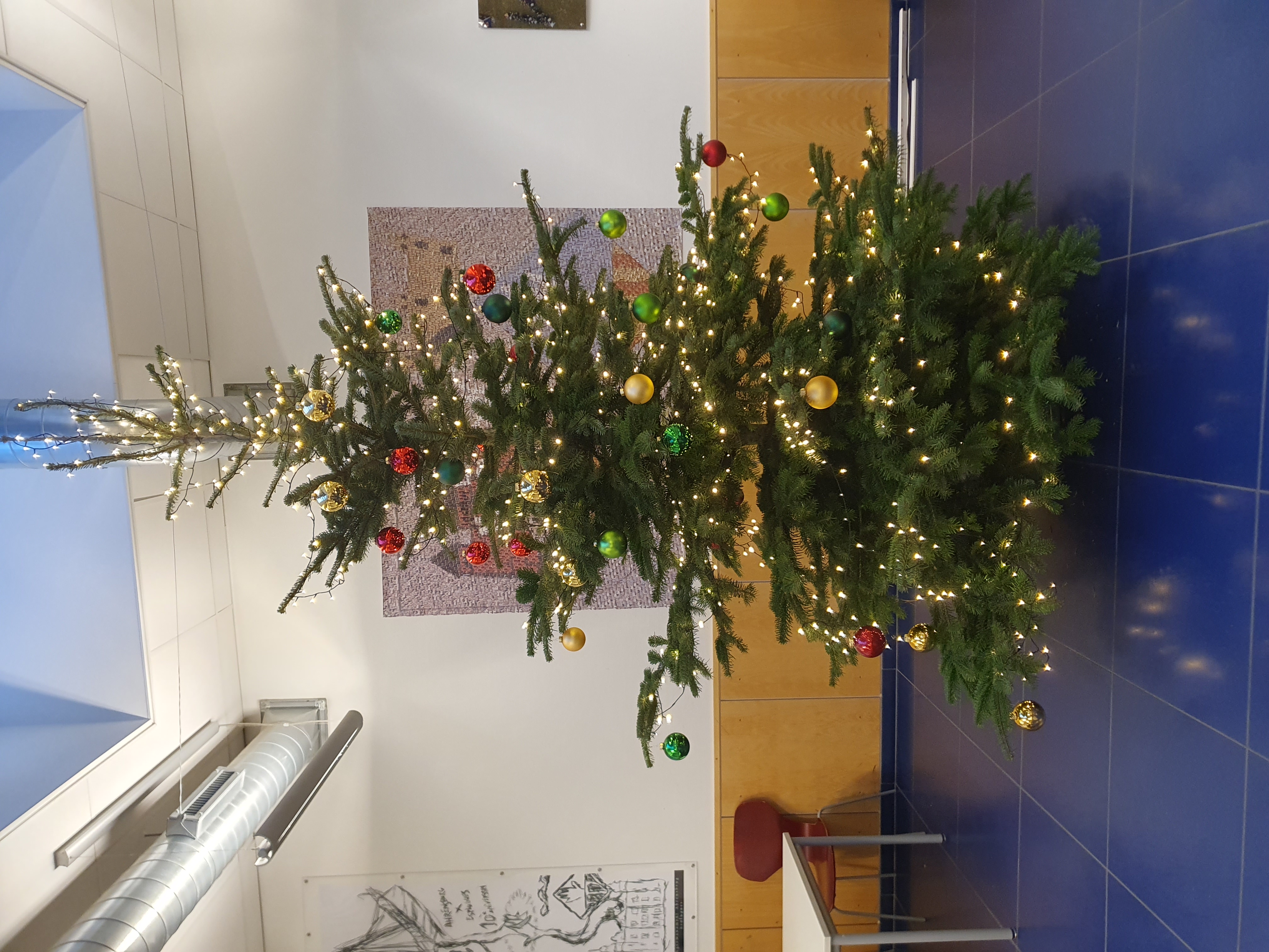 Wie in jedem Jahr haben die Hausmeister eine große Tanne in der Cafeteria platziert und festlich geschmückt. Diese erinnert hoffentlich alle daran, dass trotz vieler Klassenarbeiten nun bald die "schönste Zeit des Jahres" ansteht.