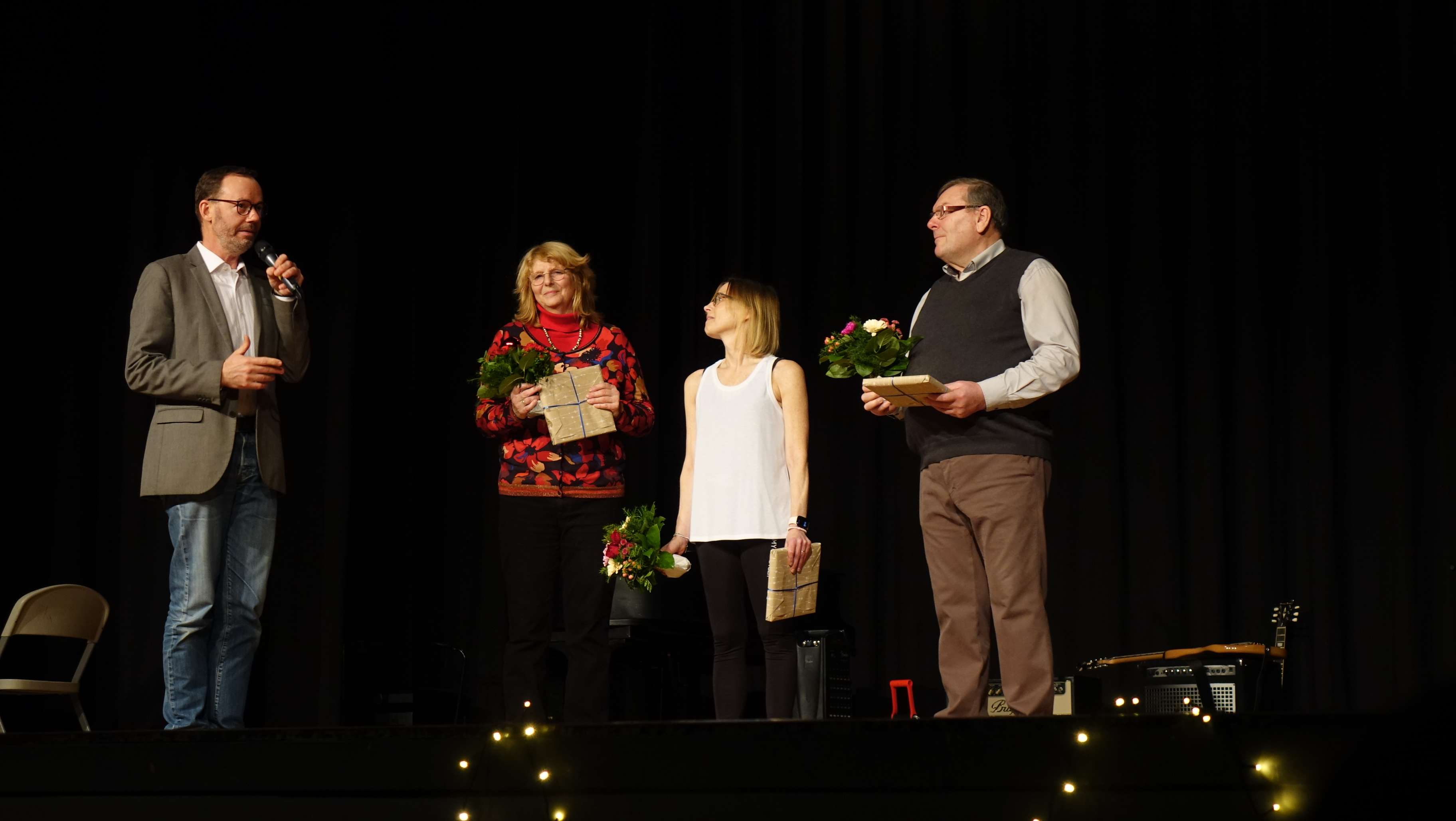 Einige Kursleitungen sind schon seit vielen Jahren im Ganztag tätig: Frau Özcan seit den Anfängen mit ihren Jazztanz-Kursen, Frau Richter leitete und leitet seit 2008 zahlreiche Förder- und Forderangebote, Herr August ist seit 2011 in der Holz- und Metallwerkstatt mit an Bord. Stellvertretend für die vielen anderen Kursleitungen werden sie von Herrn Hack und Herrn Müller für ihr großes und langjähriges Engagement für die Schule geehrt.