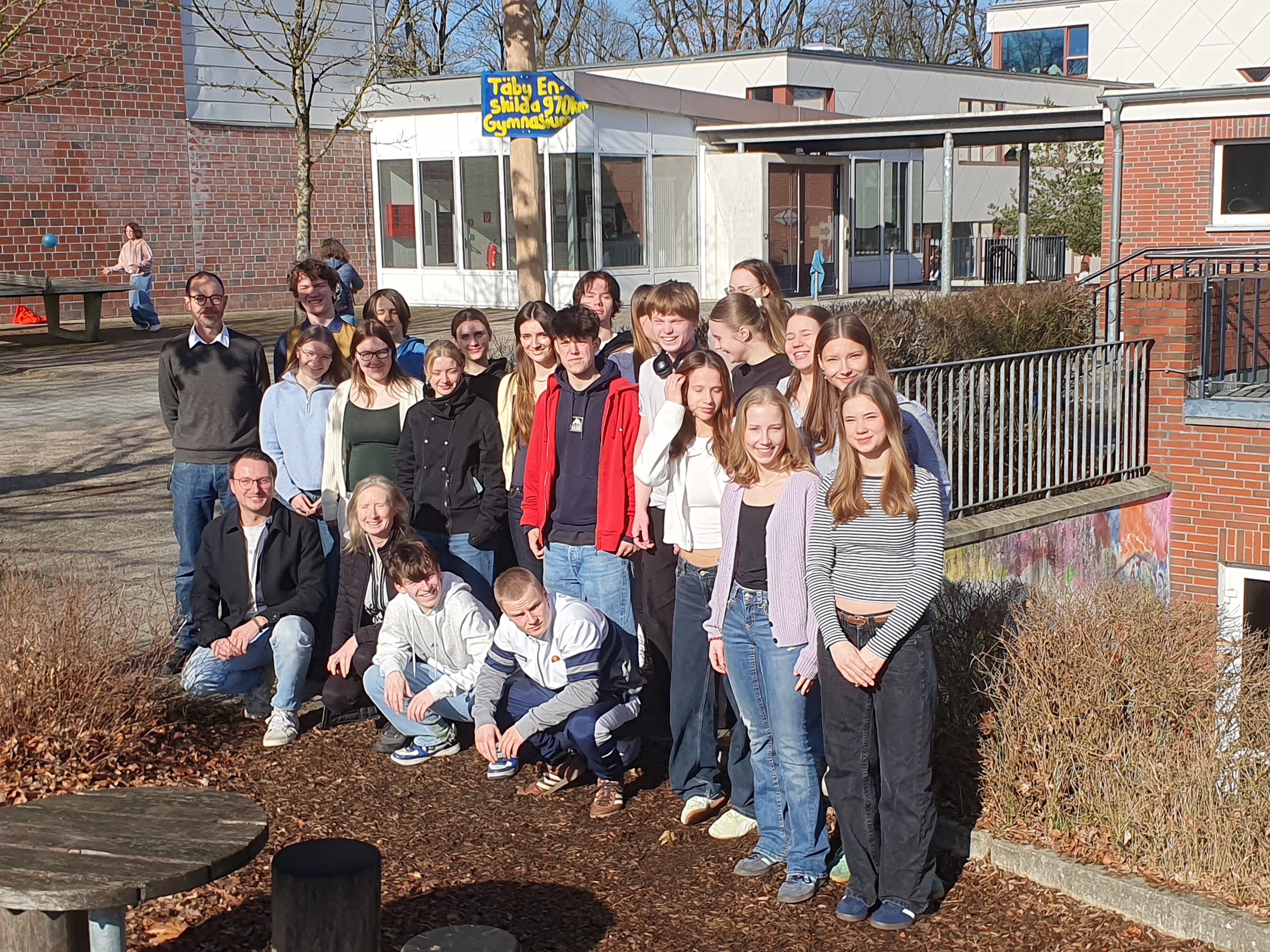 Den Auftakt machte die schwedische Partnerschule Täby Enskilda, zudem sich ehemalige und aktuelle Teilnehmende sowie Schulleiter Christian Hack und die betreuenden Lehrkräfte Brenda Peters und Erik Balschun zu einem Foto versammelten.