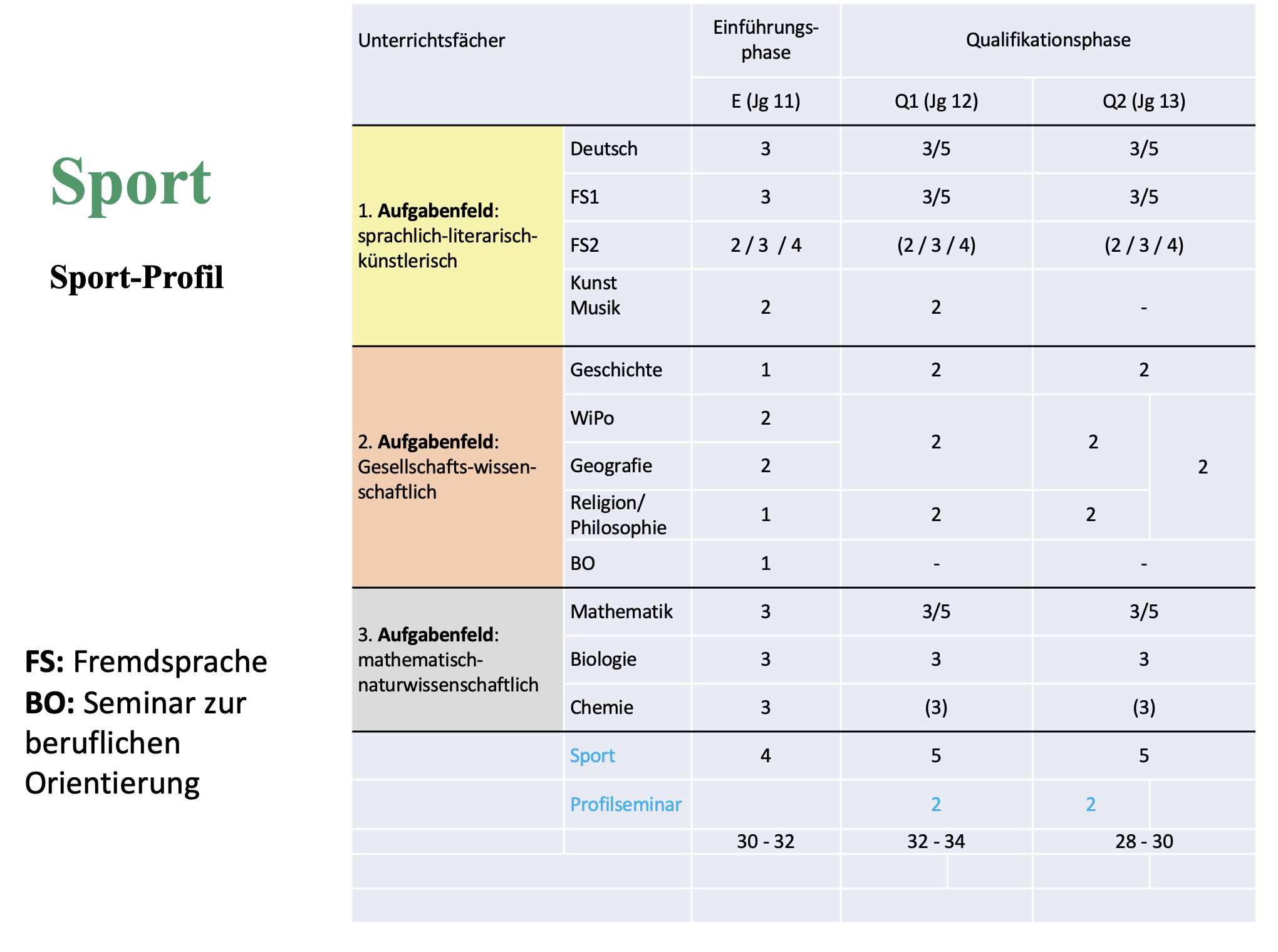 Mit Beginn der Oberstufe können und müssen die Schülerinnen und Schüler inhaltliche Schwerpunkte setzen und sich neben den obligatorischen Kernfächern Deutsch, Mathematik und Englisch für ein so genanntes Profilfach zu entscheiden. Das können an der SLG Biologie oder Wirtschaft/Politik oder Geografie oder Sport sein. Diese Profilfächer werden auf erhöhtem Niveau und mit erhöhter Stundenzahl unterrichtet. Im Sportprofil beinhaltet der Unterricht sowohl verschiedene Sportarten in der Praxis als auch die theoretischen Grundlagen und die globale Bedeutung von Sport in der Gesellschaft und der Wirtschaft.