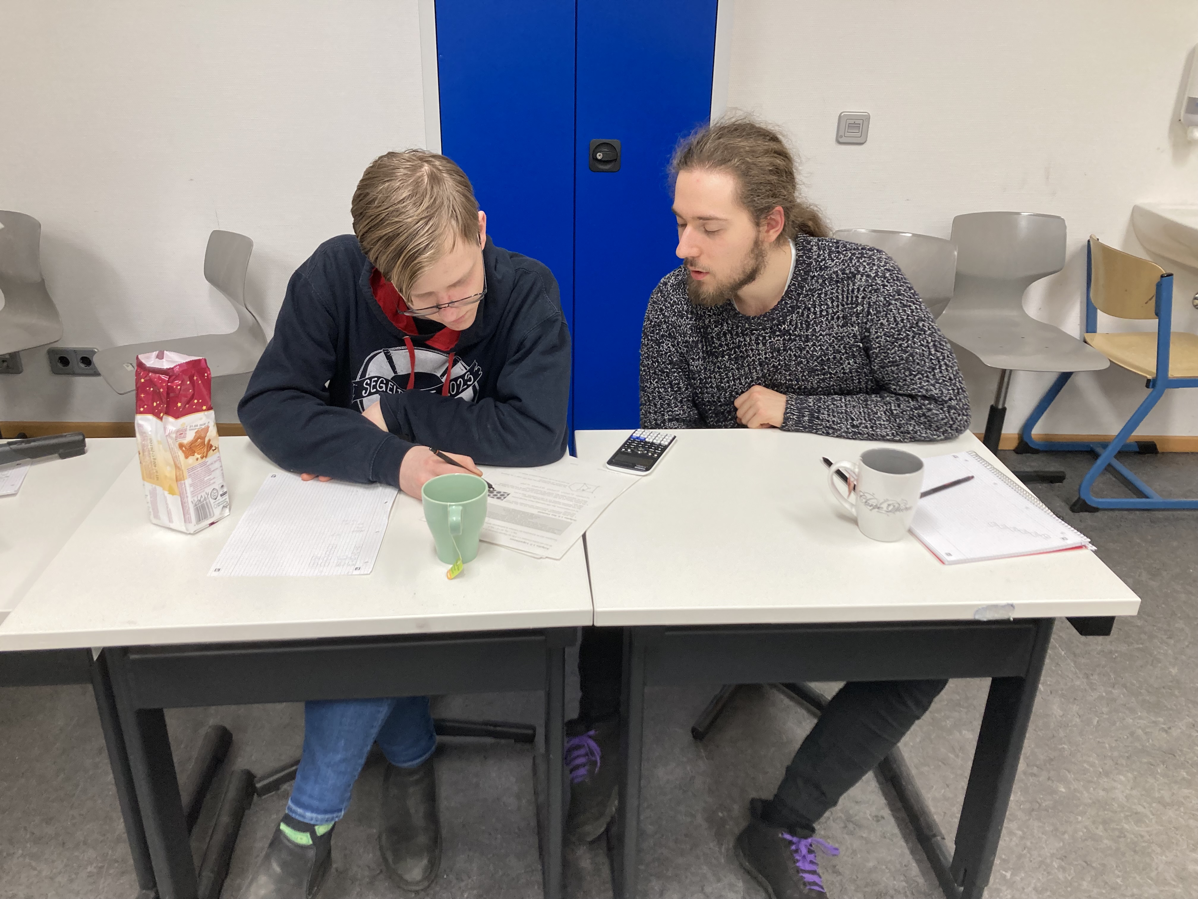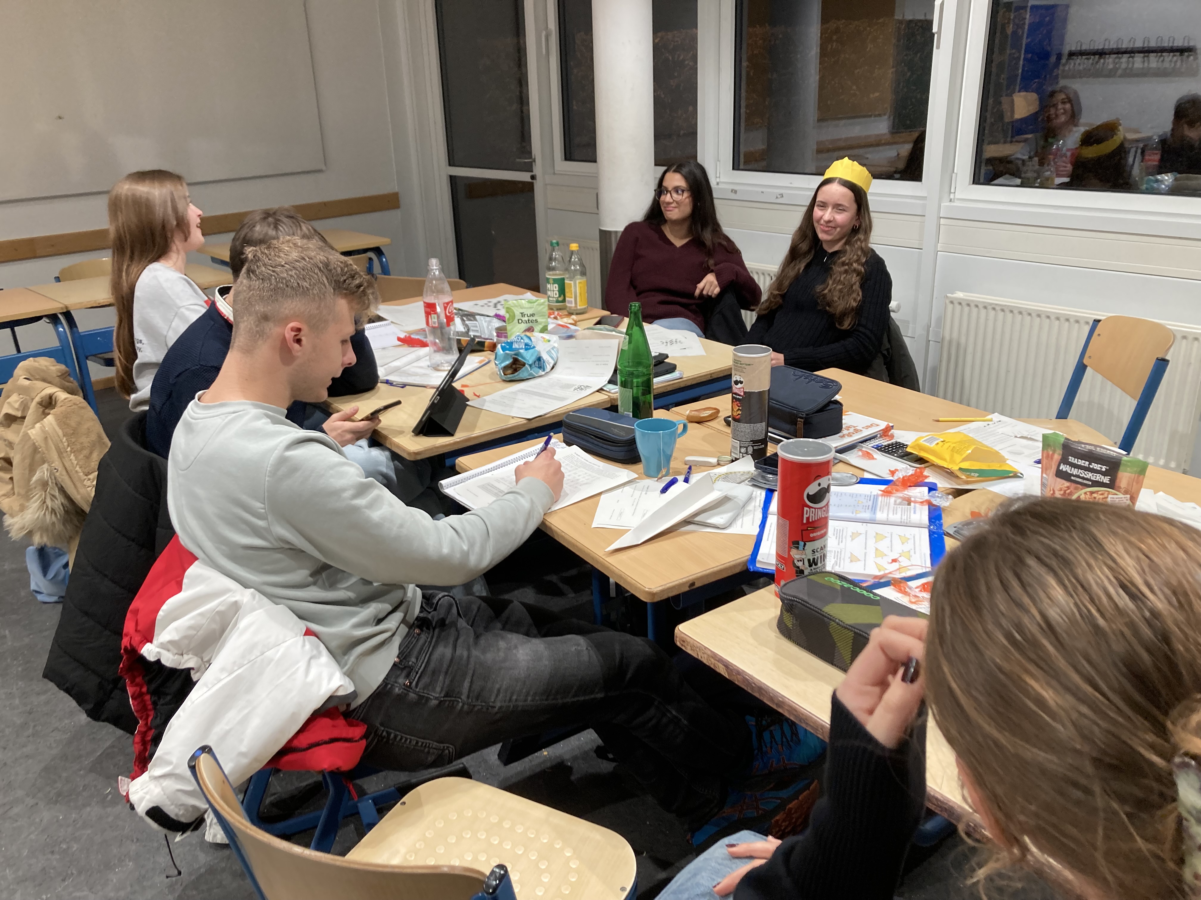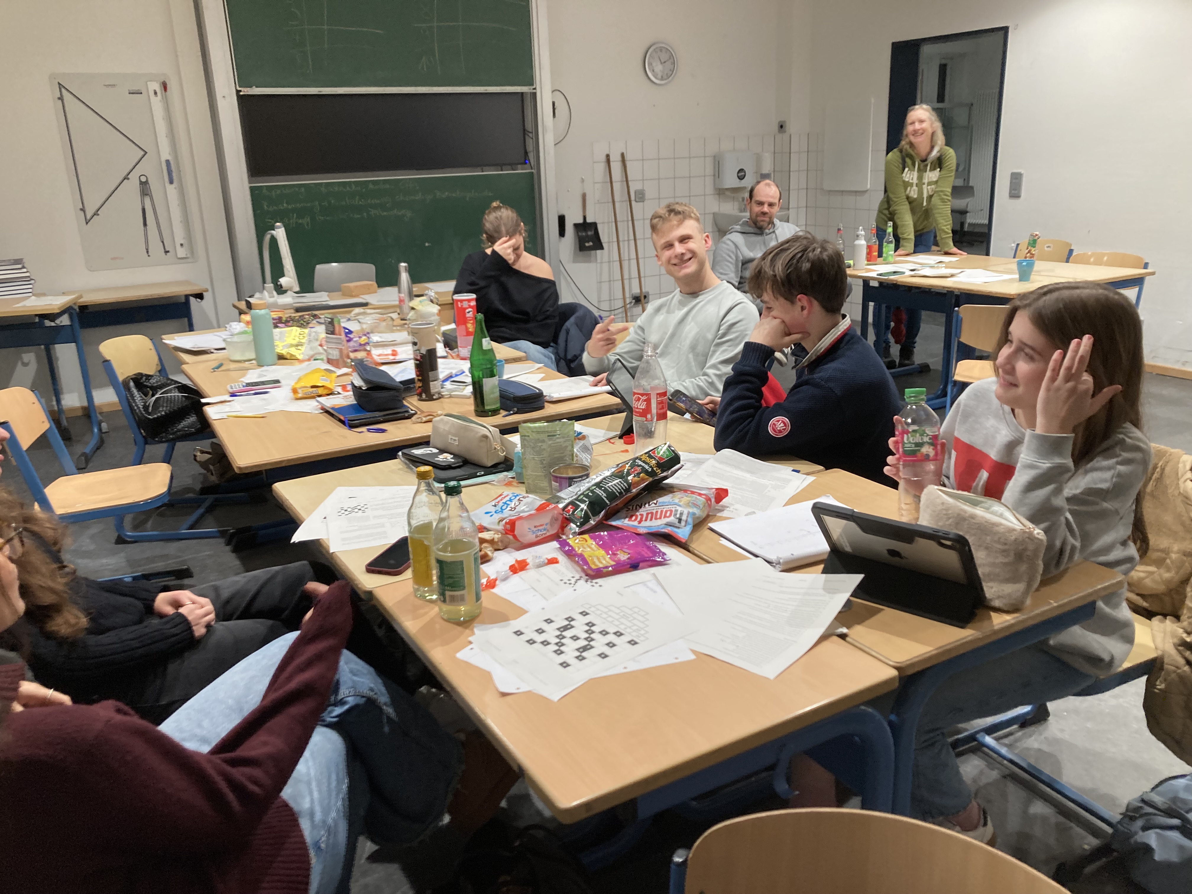 Im Matheunterricht der Oberstufe liegt der Unterrichtsfokus nun mal auf der Abiturvorbereitung. Sich stundenlang mit dröhnenden Hardstyle-Bässen im Hintergrund Knobelaufgaben zu widmen, kommt da schnell zu kurz. Ein großes Buffet und heißer Tee hielten uns bei Laune, womit wir es durch die erste Runde schafften.
