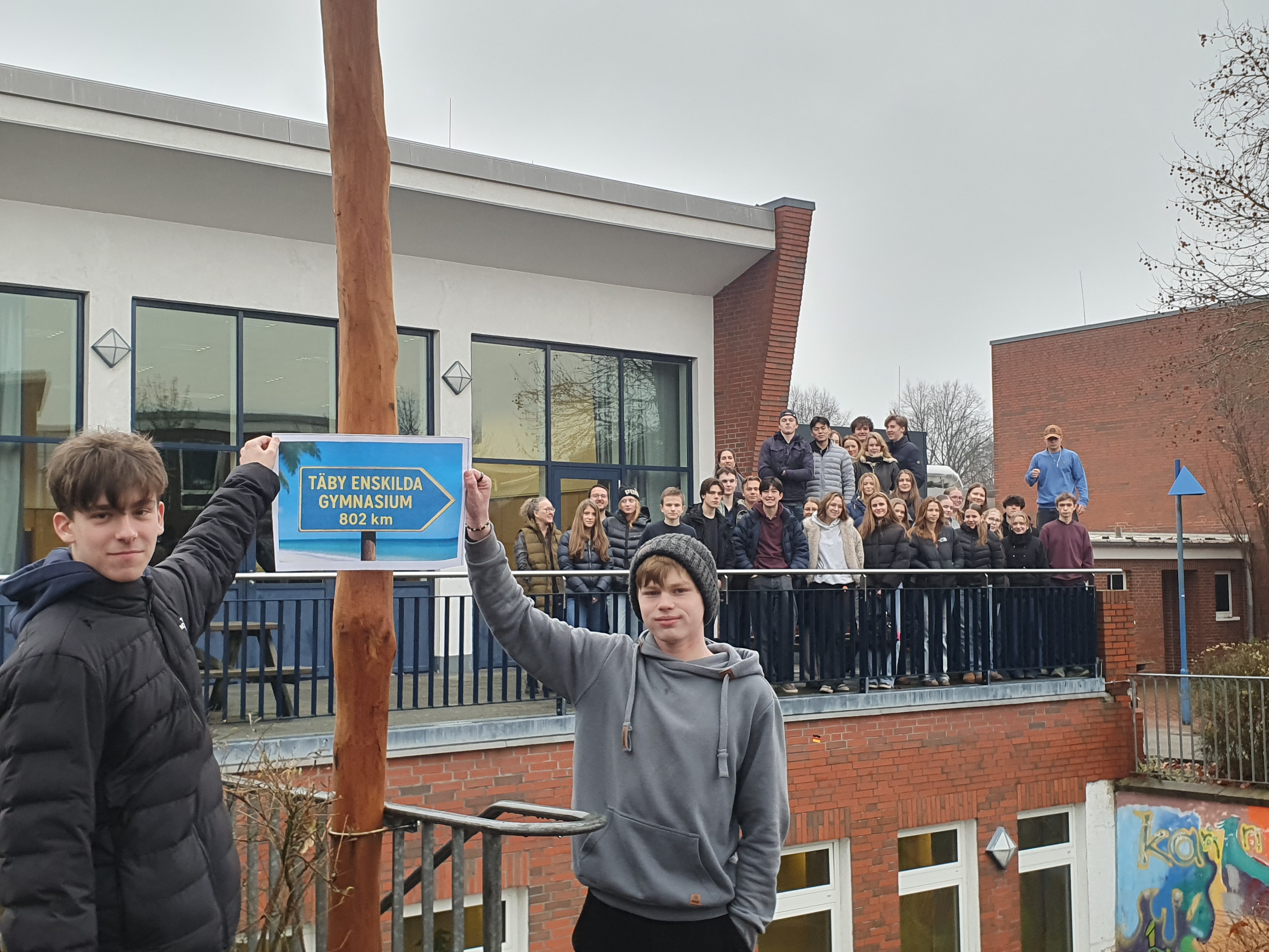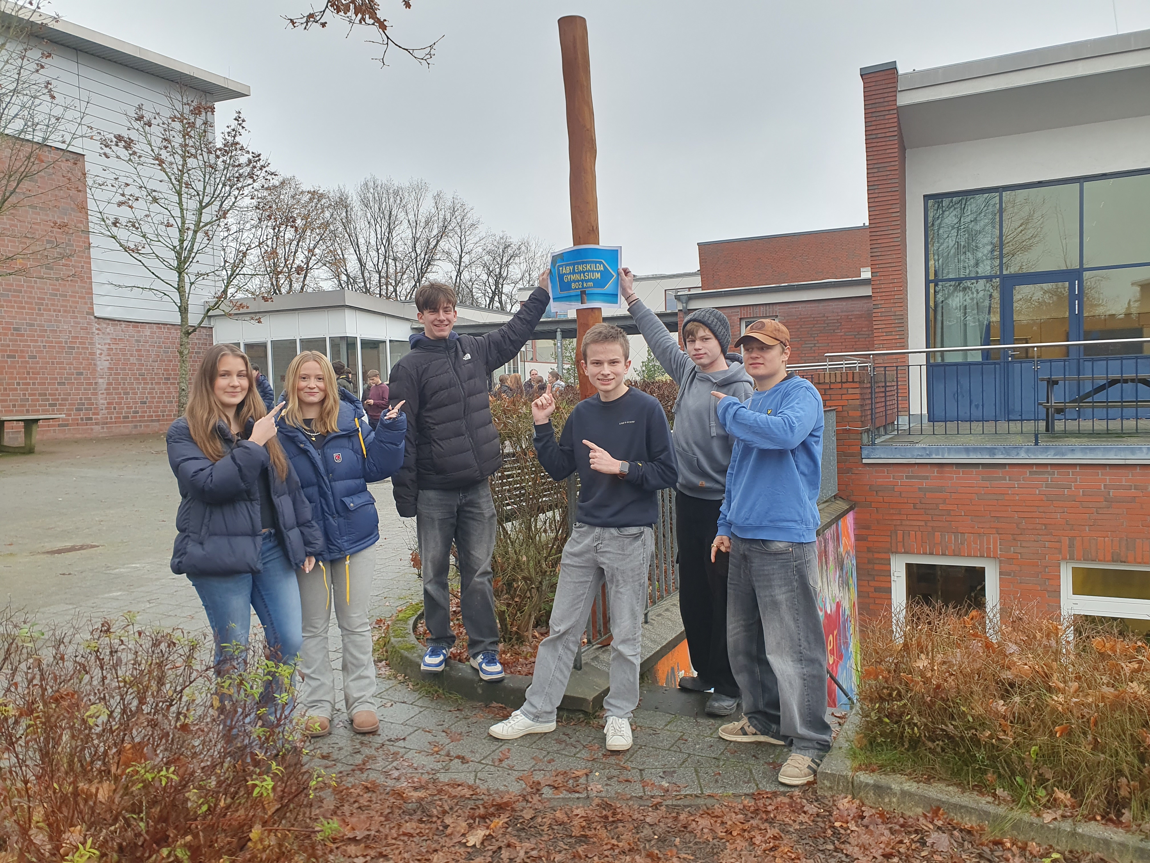 Der Abschluss der Woche bildete der Freitag, an dem der 11. Jahrgang die schwedischen Schülerinnen und Schüler mit in den Unterricht nahmen. Zudem machte man ein symbolisches Foto an dem neuen Pfahl, der 2026 mit Wegweisern zu allen Partnerschulen der SLG geschmückt wird.