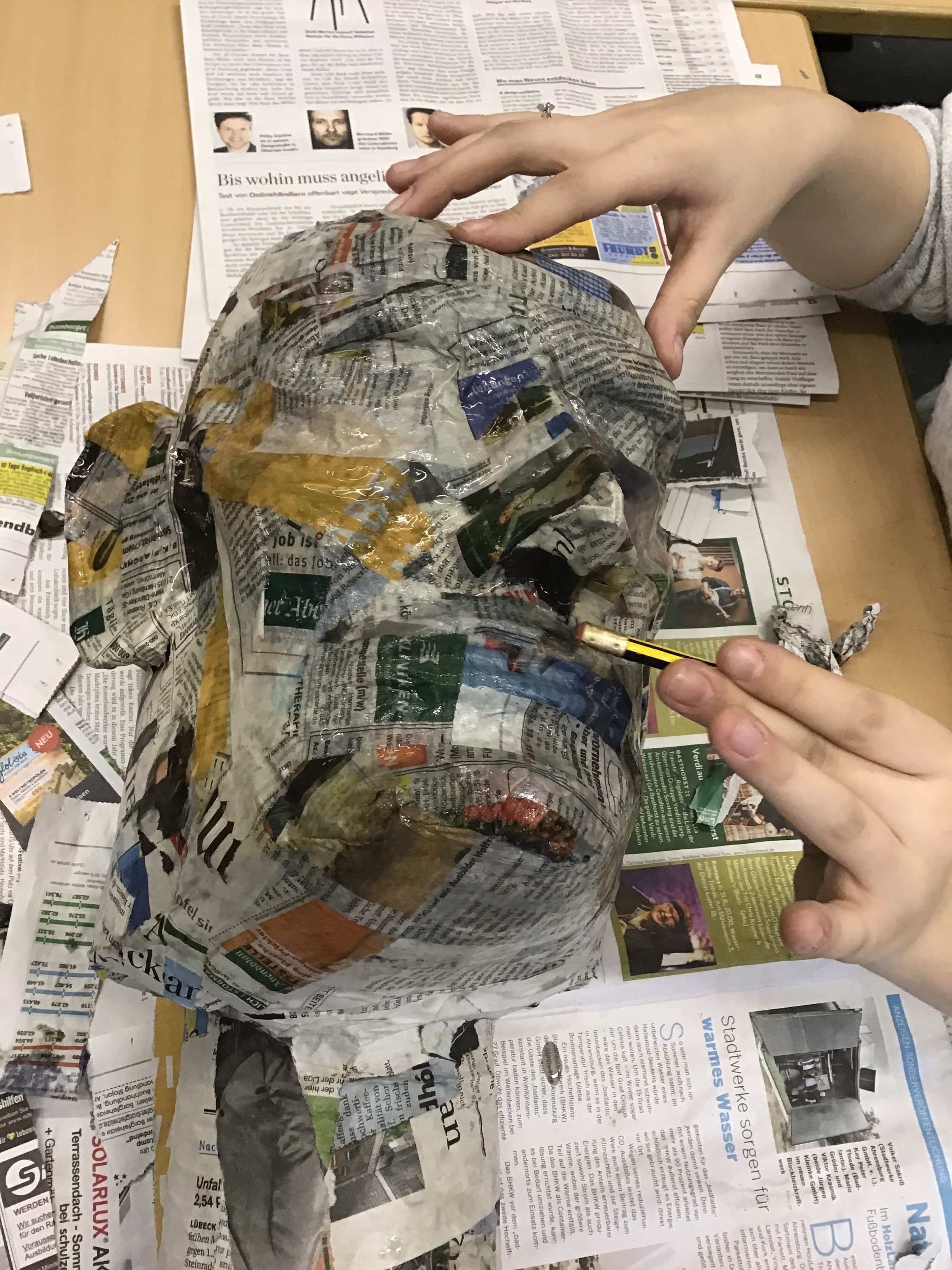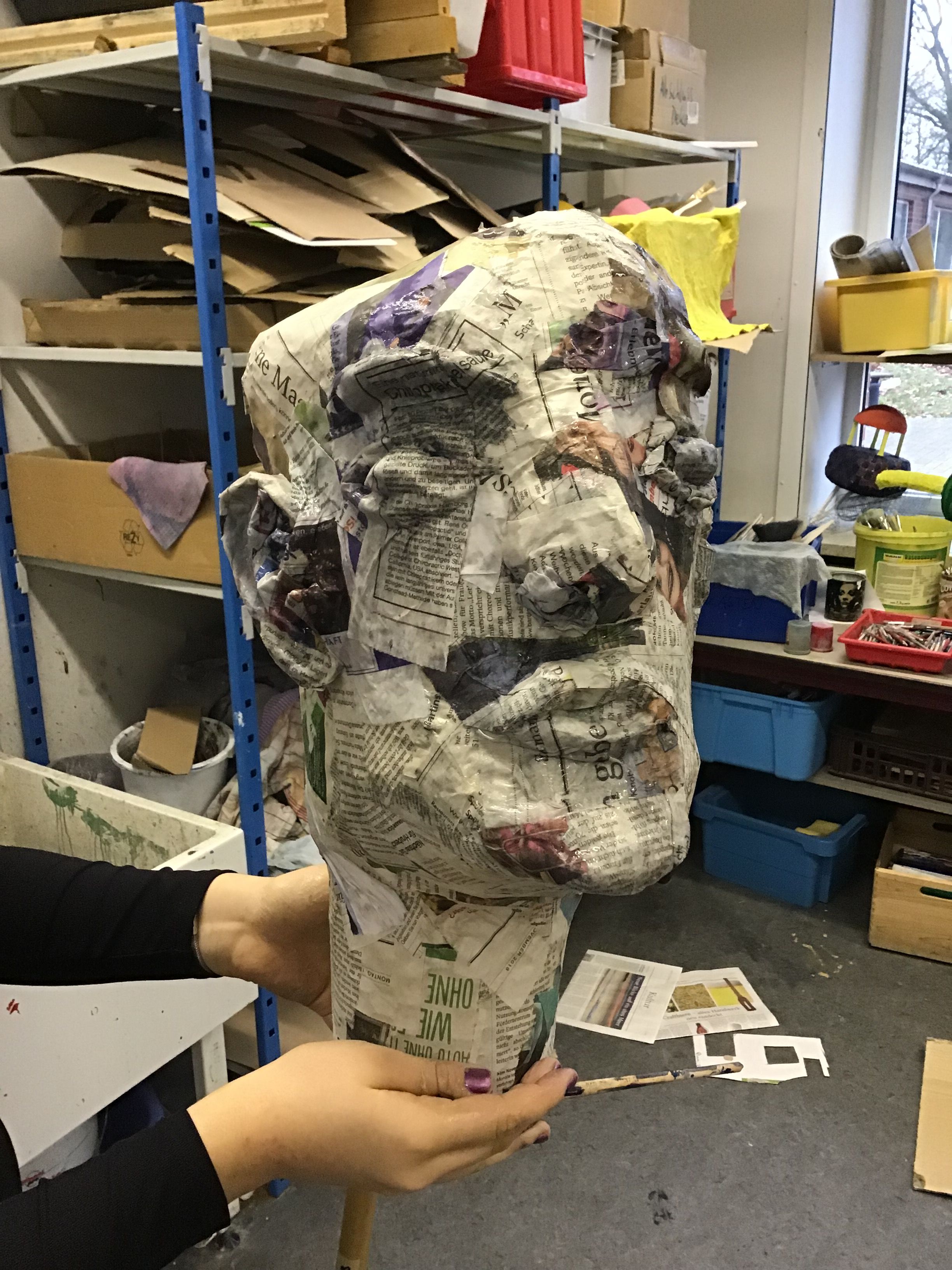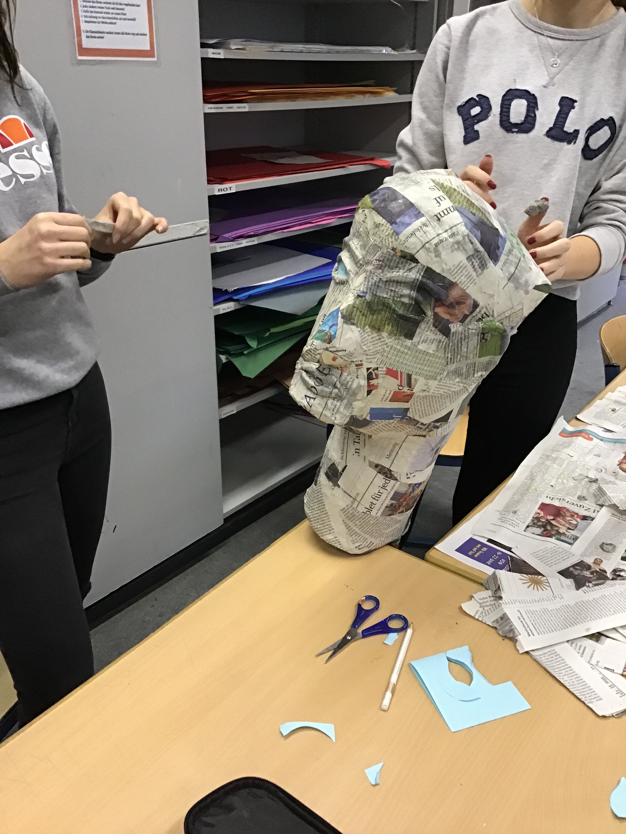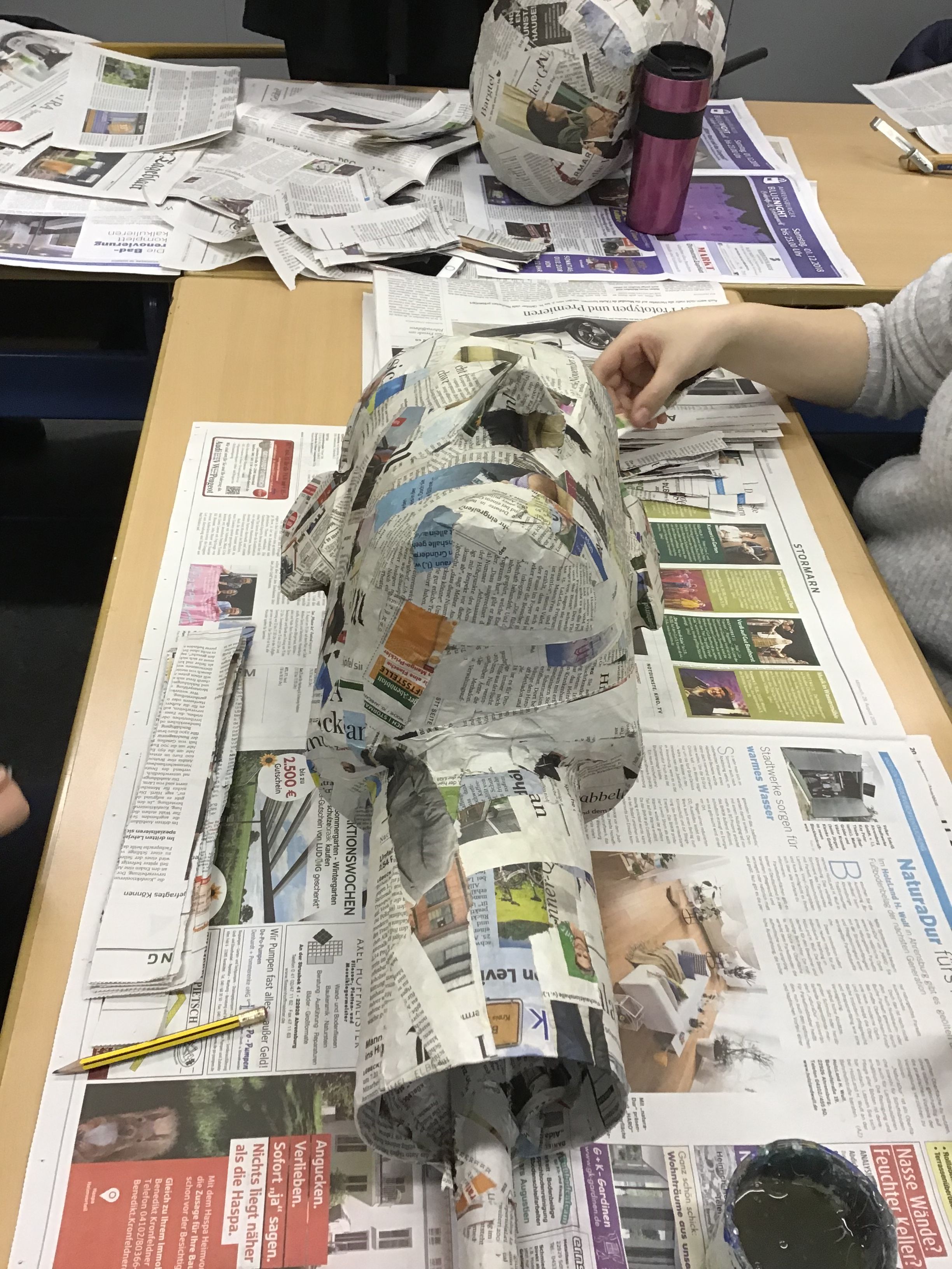 Der WPK-9 Kunst arbeitet an überlebensgroßen Figuren, die später wie große Stabpuppen auf der Bühne gespielt werden können. Der Kunstkurs fertigt die Figuren für den WPK Darstellendes Spiel, der in einem Jahr mit Hilfe der Figuren ein Theaterstück entwickeln wird.
