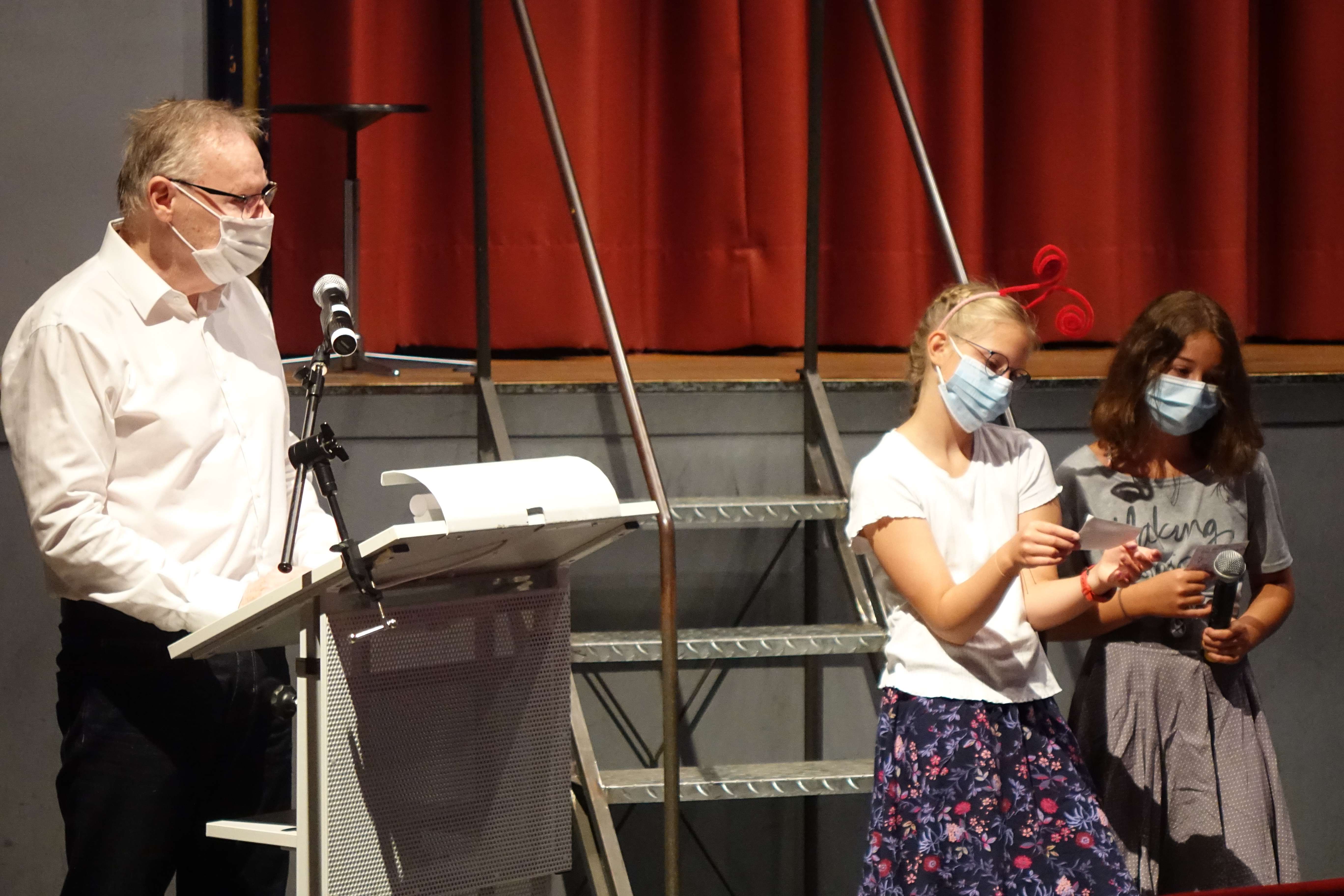 Organisatorisch musste die Einschulung natürlich angepasst werden, sodass in diesem Jahr jede Klasse einzeln und mit deutlich weniger Gästen eingeschult wurde. So lernte zunächst die Klasse 5a ihre Klassenlehrkräfte Frau Mündel und Herrn Reimers kennen. Danach folgte die Klasse 5b mit Frau Koch und Frau Sander. Am Schluss war die Klasse 5c an der Reihe, die von Frau Moje und Herrn Gasde betreut wird. Jeweils im Anschluss an den Festakt im Theatersaal ging es mit den neuen Mitschülerinnen und Mitschülern sowie den Lehrkräften ein erstes Mal - auf den gültigen Laufwegen - in den jeweiligen Klassenraum. Dort konnten sich alle schon ein bisschen besser kennenlernen.