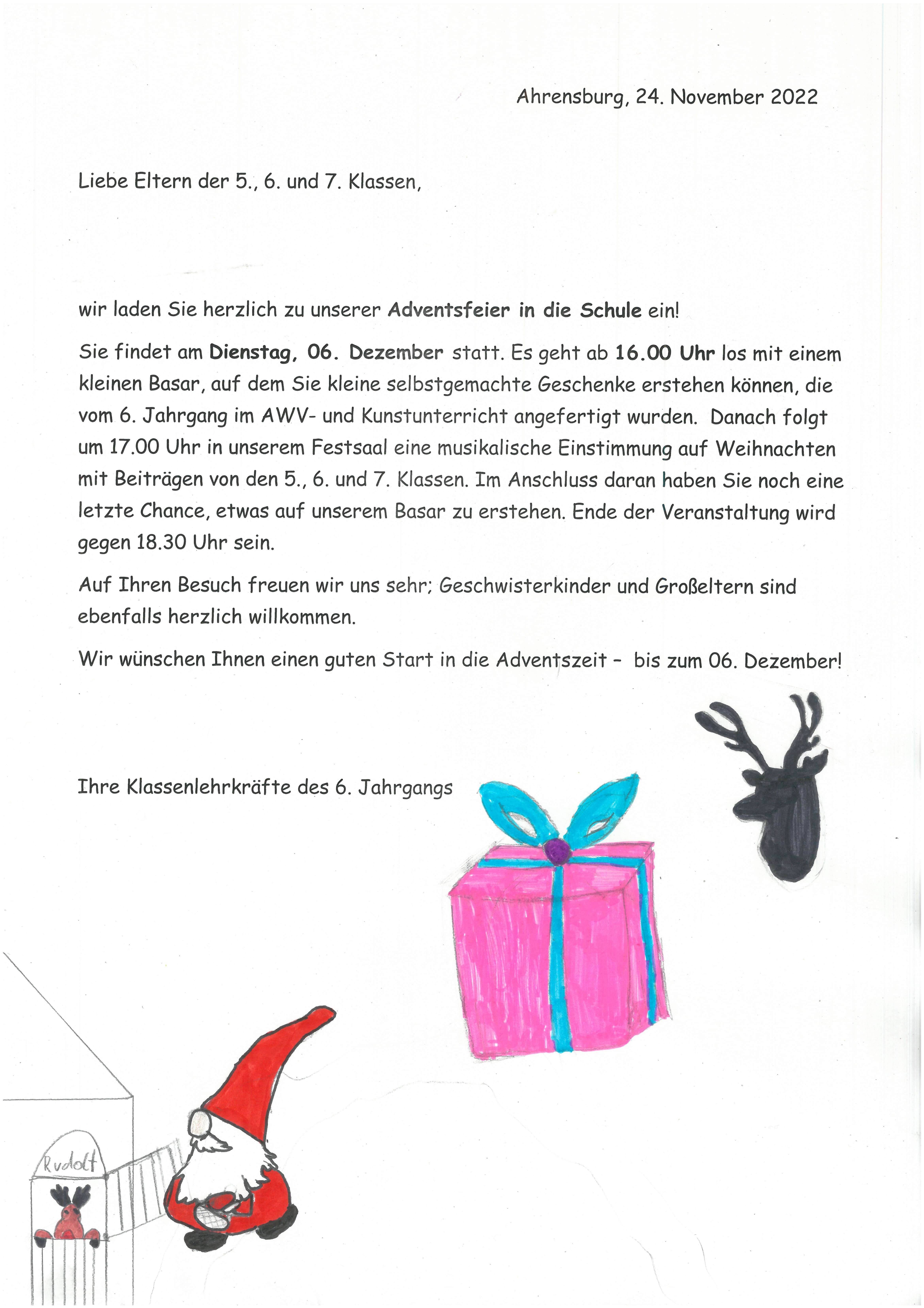 Wie immer in der Adventszeit veranstaltet die Unterstufe der SLG Ahrensburg - unter der Federführung des 6. Jahrgangs - eine kleine Feier mit Musik und Adventsbasar. Zu dieser Veranstaltung am 6. Dezember 2022 laden wir die Eltern, Großeltern und Geschwister unserer 5. bis 7. Klässlerinnen und Klässler herzlich ein! Einzelheiten entnehmen Sie bitte der Einladung. Wir freuen uns auf Ihren Besuch!